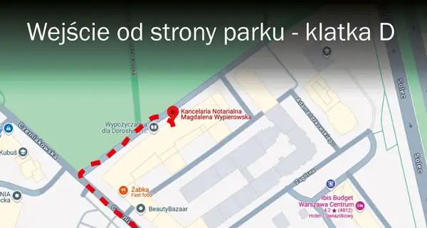 Kancelaria Notarialna mieści się w dzielnicy Śródmieście, na Solcu, przy ulicy Czerniakowskiej 178a lok. 35, w bezpośrednim sąsiedztwie Parku Marszałka Edwarda Rydza-Śmigłego. Kancelaria mieści się na pierwszym piętrze budynku mieszkalnego, w którym znajduje się winda.